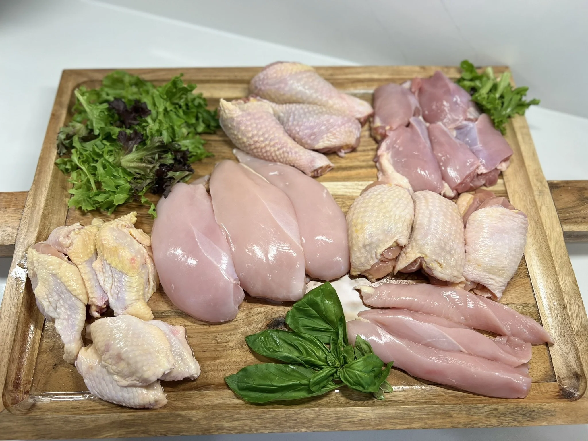 One pack of skinless boneless Chicken Breast, One pack of boneless skin-on chicken thighs, one pack of boneless skinless chicken thighs, one pack of chicken wing sections, one pack of chicken tenders, and one pack of drumsticks.